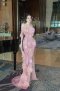เดรสยาวสีชมพูสายเดี่ยวผ่าข้างตกแต่งขนนกและลูกปัดกลิตเตอร์