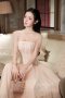 เดรสยาวสีชมพูเกาะอกตกแต่งผ้าซีทรูที่ไหล่และโบว์คริสตัล