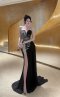 เดรสยาวสีดำเกาะอกผ่าข้างตกแต่งคริสตัลที่อกและเอว
