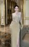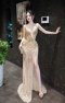 เดรสยาวสีทองสายเดี่ยวผ่าข้างตกแต่งลูกปัดคริสตัลสีทองและมุก