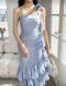 เดรสยาวสีฟ้าสายเดี่ยวจับสม็อกที่เอวตกแต่งดอกไม้ที่ไหล่
