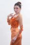 เดรสยาวสีส้มคล้องคอเว้าเอวตกแต่งลูกปัดสีส้มแดงทั้งตัว