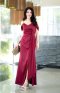 เดรสยาวสีแดงสดสายเดี่ยวชายระบายดูเรียบและหรูหรา