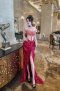 เดรสยาวสีแดงเกาะอกผ่าหน้าตกแต่งคริสตัลสีแดง