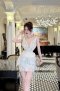 เดรสสั้นสีขาวเกาะอกตกแต่งโบว์ที่หน้าแกและคริสตัลทั้งชุด