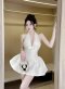 เดรสสั้นสีขาวคล้องคอทรงระบายตกแต่งลูกไม้และโบว์ที่อก