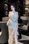 เดรสสั้นสีขาวปาดไหล่ตกแต่งผ้าซีทรู ขนนกและคริสตัล