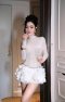 เดรสสั้นสีขาวแขนยาวตกแต่งระบายและกลิตเตอร์ทั้งชุด