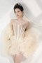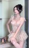 เดรสสั้นสีเบจกระโปรงระบายตกแต่งคริสตัลบริเวณเอว