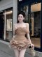 เดรสสั้นสีเบจเข้มเปิดไหล่มีระบายที่ชายกระโปรง
