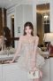 เดรสสั้นสีเบจลายจุดสีดำกระโปรงระบายสายเดี่ยวตกแต่งดอกไม้