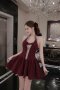 เดรสสั้นสีแดงเข้มคล้องคอประดับเพชรคริสตัลและโบว์ที่กลางอก