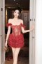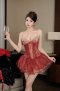 เดรสสั้นสีแดงตกแต่งลูกไม้ซีทรูสายเดี่ยวกระโปรงระบายสองชั้น